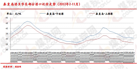 國內(nèi)沿海煤炭運輸市場繼續(xù)保持微幅震蕩,自10月26日至11月02日,秦皇島港至寧波港(1.5-2萬噸)煤炭海運費微降0.3元/噸至30.9元/噸;秦皇島港至上海港(4-5萬噸)煤炭運費降0.4元/噸至26.4元/噸;秦皇島港至張家港(2-3萬噸)煤炭運費降0.4元/噸至31.9元/噸。