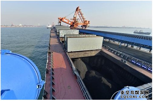 一艘輪船靠泊在秦皇島港煤炭碼頭裝貨。