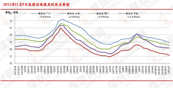 沿海運(yùn)費(fèi):截止到11月9日,現(xiàn)秦皇島港-廣州港(5-6萬DWT)運(yùn)費(fèi)34.7元/噸,較2日下跌0.6元;秦皇島-福州(3-4萬DWT)運(yùn)費(fèi)32.8元/噸,下跌0.6元。天津-上海(2-3萬DWT)運(yùn)價(jià)29.5元/噸,回落0.2元;天津-鎮(zhèn)江(1-1.5萬DWT)運(yùn)價(jià)35.6元/噸,回落0.3元;秦皇島-寧波(1.5-2萬DWT)運(yùn)價(jià)30.8元/噸,下降0.1元。截止到11月9日沿海六大電廠存煤總量為1387.1萬噸,周環(huán)比減少22.37萬噸;存煤可用天數(shù)為22.22天,較上周同期減少1.84天。本期沿海煤炭運(yùn)價(jià)出現(xiàn)企穩(wěn)跡象,但是由于上漲動(dòng)力不足,利好因素難以支撐運(yùn)價(jià)回升。主要由于前期沿海運(yùn)價(jià)已經(jīng)連續(xù)下跌2月,運(yùn)價(jià)已經(jīng)跌至船東心理底線。長時(shí)間的低位運(yùn)價(jià)迫使部分船東選擇停運(yùn)或者進(jìn)行船舶檢修,造成市場(chǎng)運(yùn)力短暫回避、運(yùn)價(jià)緩慢筑底。另一方面由于氣溫的偏低使得沿海地區(qū)對(duì)下水煤炭的需求有所提高,增加對(duì)北方煤炭或進(jìn)口煤炭的采購動(dòng)作,增強(qiáng)運(yùn)價(jià)上漲預(yù)期。綜合分析認(rèn)為隨著冬儲(chǔ)煤的進(jìn)行,下游企業(yè)煤炭庫存持續(xù)偏高,以及日耗偏低的特征影響,又使得沿海運(yùn)輸受阻,制約著運(yùn)價(jià)的回暖,目前航運(yùn)市場(chǎng)供大于求的現(xiàn)象依然存在,預(yù)計(jì)后期沿海運(yùn)價(jià)將繼續(xù)受到壓制。