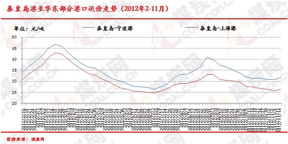 華東沿海運(yùn)價(jià)出現(xiàn)弱勢反彈,各航線漲勢不一。其中秦皇島-寧波(1.5-2萬DWT)運(yùn)價(jià)31.8元/噸,較上期上漲1元;秦皇島-上海(4-5萬DWT)運(yùn)價(jià)26.3元/噸,較上期上漲0.6元;天津-上海(2-3萬DWT)運(yùn)價(jià)30元/噸,較上期上漲0.5元;天津-鎮(zhèn)江(1-1.5萬DWT)運(yùn)價(jià)37.3元/噸,較上期上漲1.7元;黃驊港-上海(3-4萬DWT)運(yùn)價(jià)27.3元/噸,較上期上漲0.6元;京唐港-寧波(4-5萬DWT)運(yùn)價(jià)26.1元/噸,較上期下跌0.6元。目前航運(yùn)市場呈現(xiàn)沿海煤炭運(yùn)價(jià)漲跌互現(xiàn)的局勢,運(yùn)價(jià)上漲的主要集中在短途的小型船舶上面,大型運(yùn)輸船舶運(yùn)價(jià)繼續(xù)弱勢下探,不過下探幅度陸續(xù)縮小。