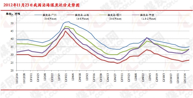 沿海運(yùn)費(fèi):截止到11月23日,現(xiàn)秦皇島港-廣州港(5-6萬DWT)運(yùn)費(fèi)35元/噸,較16日上漲0.4元;秦皇島-福州(3-4萬DWT)運(yùn)費(fèi)33.5元/噸,微漲0.5元。天津-上海(2-3萬DWT)運(yùn)價30.6元/噸,回升0.6元;天津-鎮(zhèn)江(1-1.5萬DWT)運(yùn)價38.6元/噸,回升1.3元;秦皇島-寧波(1.5-2萬DWT)運(yùn)價33.5元/噸,回升1.7元。截止到11月23日沿海六大電廠存煤總量為1370.7萬噸,周環(huán)比增加28.6萬噸;存煤可用天數(shù)為20.79天,較上周同期減少1.56天。本期國內(nèi)沿海運(yùn)價繼續(xù)延續(xù)上周弱勢上漲的局面,近期華南地區(qū)進(jìn)口煤年底的集中到貨,以及前期國內(nèi)煤價下跌,華南地區(qū)對內(nèi)貿(mào)煤炭采購熱情趨減,在貨源不足的壓力下,華南航線震蕩徘徊,缺少回漲的動力。目前國內(nèi)煤炭市場仍呈現(xiàn)相對寬松的狀態(tài)。沿海運(yùn)價上漲主要還是由于船東封鎖一部分運(yùn)力造成的,小型船舶交易較為活躍。近期電廠日耗受季節(jié)性因素影響緩慢上升,供需方面稍有平衡等利好因素支撐本周海運(yùn)價格繼續(xù)上漲。目前沿海運(yùn)輸價格的上漲和下跌勢頭仍不明朗,預(yù)計近期運(yùn)價將呈現(xiàn)底部震蕩趨勢,運(yùn)價的回暖要等到冬季用煤需求提升等利好因素的進(jìn)一步刺激。