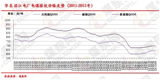 電廠發(fā)電量和日耗煤量有所下降。受經(jīng)濟(jì)形勢的影響,鎮(zhèn)海電廠今年的發(fā)電量和日耗煤量均呈現(xiàn)下降的態(tài)勢。1-10月該廠共發(fā)電37.7億度,比去年同期減少8.3億度。10月份該廠共耗煤10.6萬噸,同比減少0.6萬噸。1-10月份共耗煤113.8萬噸,同比減少27.2萬噸。據(jù)浙能集團(tuán)統(tǒng)計,10月份日均耗煤量為10.3萬噸,同減0.8萬噸。最新數(shù)據(jù)顯示,2012年11月上旬,太倉華能、南通華能、上海石洞二電廠接收5000、5500、5800大卡大同煤價格分別為605元/噸、690元/噸、735元/噸;夏港電廠、揚(yáng)州二電接收5000、5500大卡蒙煤價格分別為610元/噸、695元/噸。上海石洞一廠、南通天生港電廠接收5000、5500大卡貧瘦煤價格分別為590元/噸、640元/噸,較上一期均上漲5元。截止到上周末山東地區(qū)主力電廠開機(jī)負(fù)荷70%左右,存煤可用天數(shù)為27天;江蘇地區(qū)電廠開機(jī)負(fù)荷為65%左右,存煤可用天數(shù)為25天;浙江地區(qū)電廠開機(jī)負(fù)荷未70%左右,存煤可用天數(shù)為27天。目前華東地區(qū)氣溫有所下降,電廠發(fā)電量有所提升,日耗煤量較之前稍有增加,但是對當(dāng)前煤炭市場影響不大,預(yù)計11月中下旬電廠采購價格能將呈現(xiàn)下滑態(tài)勢。