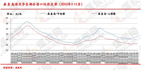 本周華東沿海煤炭運(yùn)價繼續(xù)呈現(xiàn)反彈趨勢,短途航線漲幅有所擴(kuò)大。中秦皇島-寧波(1.5-2萬DWT)運(yùn)價33.5元/噸,較上期上漲1.7元;秦皇島-上海(4-5萬DWT)運(yùn)價26.6元/噸,較上期上漲0.3元;天津-上海(2-3萬DWT)運(yùn)價30.6元/噸,較上期上漲0.6元;天津-鎮(zhèn)江(1-1.5萬DWT)運(yùn)價38.6元/噸,較上期上漲1.3元;黃驊港-上海(3-4萬DWT)運(yùn)價27.7元/噸,較上期上漲0.4元;京唐港-寧波(4-5萬DWT)運(yùn)價26.5元/噸,較上期下跌0.4元。目前航運(yùn)市場呈現(xiàn)沿海煤炭運(yùn)價漲跌互現(xiàn)的局勢,運(yùn)價上漲的主要集中在短途的小型船舶上面,大型運(yùn)輸船舶運(yùn)價繼續(xù)弱勢下探,不過下探幅度陸續(xù)縮小。