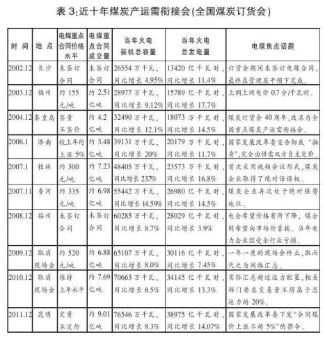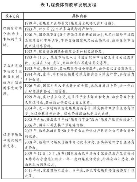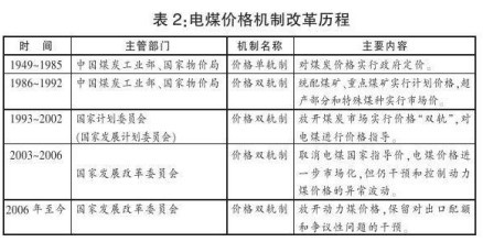 我國煤炭體制改革發(fā)展歷程大概經歷了三個階段:1949~1992年,以國家計劃分配為主,市場調節(jié)為輔;1993~2002年,計劃分配向市場配置資源過渡,運力計劃由國家宏觀管理;2002年至今,煤炭市場化體制機制不斷完善。(詳見表1)我國電煤價格機制改革歷程和煤炭體制改革發(fā)展大體同步,細分開來,經歷了五個階段:1949~1985年,由國家制定煤炭價格,實行價格單軌制,這一時期的煤炭價格既不反映價值,也不反映供求關系;1986~1992年,國家控制大部分煤炭價格,實行價格雙軌制,全國統(tǒng)配煤礦、重點煤礦的煤炭,實行統(tǒng)一的計劃價格,超產部分實施加價,特殊煤種實行市場價;1993~2002年,煤炭價格向市場化過渡,隨著煤炭產量大幅增加,特別是市場化改革進程加快,國家逐漸放開了除發(fā)電用煤以外的煤炭價格;2003~2006年,國家取消對電煤的國家指導價,煤炭產品的價格主要由市場供需關系決定,但由于多重因素影響,電煤價格雙軌制以及電煤由政府指導定價的現(xiàn)實仍然沒有根本性改變;2006年至今,國家決定全部放開電煤價格后,但重點合同電煤價格與市場煤價格的差距仍非常大。(詳見表2)全國煤炭訂貨會 (又稱全國煤炭產運需銜接會、匯總會)作為我國煤炭產運需銜接配置的主要實現(xiàn)形式,已有50多年的歷史,會議的形式在不斷調整,內容也在不斷變化,但“煤電頂!币恢笔墙裹c話題,尤其是2002年之后,矛盾更加突出。