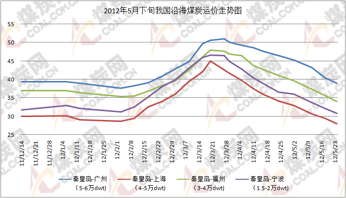 本周,我國沿海煤炭海運費仍舊繼續(xù)下行,甚至部分航線運費已跌至今年以來最低值。據(jù)煤炭網(wǎng)信息研究中心數(shù)據(jù)顯示,截止到5月24日,秦皇島-廣州(5-6萬DWT)運價39元/噸,較上期相比下跌1.4元;秦皇島-福州(3-4萬DWT)運價34元/噸,較上期相比下跌1.6元;秦皇島-寧波(3-4萬DWT)運價30.8元/噸,較上期相比下跌1.3元;天津-上海(2-3萬DWT)運價29.2元/噸,較上期相比下跌1.9元;京唐/曹妃甸-寧波(4-5萬DWT)運價28.1元/噸,較上期相比下跌2元;黃驊-上海(3-4萬DWT)運價27.9元/噸,較上期相比下跌2.2元;秦皇島-上海(4-5萬DWT)運價28元/噸,較上期相比下跌1.5元,已降至今年以來最低值。