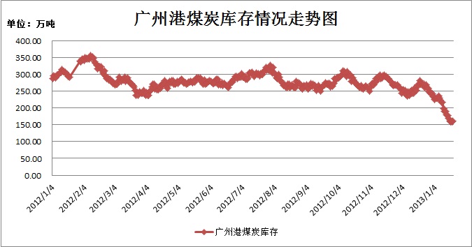 庫存方面,本周廣州庫存繼續(xù)此前的下滑趨勢,港口庫存最低突破160萬噸關(guān)口,截止1月20日廣州港煤炭庫存總計(jì)158.79萬噸,其中新沙公司102萬噸,西基公司30萬噸,新港公司8.56萬噸,黃埔公司18.22萬噸,和上周同期的189.22萬噸相比,廣州港煤炭庫存下滑了30.43萬噸,環(huán)比下滑了16.08% 。