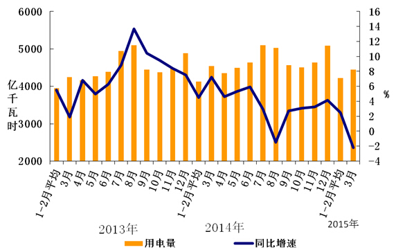 3月份,四大高載能行業(yè)用電量合計1271億千瓦時,同比下降 4.9%,增速比上年同期回落9.6個百分點,占全社會用電量的比重為28.6%。其中,化工行業(yè)用電量352億千瓦時,同比增長5.6%,增速比上年同期提高1.1個百分點;建材行業(yè)用電量182億千瓦時,同比下降22.3%,增速比上年同期回落39.3個百分點;黑色金屬行業(yè)用電量393億千瓦時,同比下降9.1%,增速比上年同期回落8.9個百分點;有色金屬冶煉行業(yè)344億千瓦時,同比增長2.4%,增速比上年同期回落1.6個百分點。