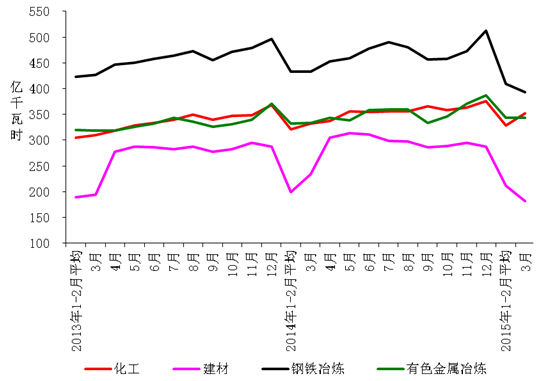 1-3月份,化學原料制品、非金屬礦物制品、黑色金屬冶煉、有色金屬冶煉四大高載能行業(yè)用電量合計3856億千瓦時,同比下降 1.3%,增速比上年同期回落5.5個百分點;合計用電量占全社會用電量的比重為29.9%,對全社會用電量增長的貢獻率為-48.1%。其中,化工行業(yè)用電量1009億千瓦時,同比增長3.6%,增速比上年同期回落0.1個百分點;建材行業(yè)用電量606億千瓦時,同比下降4.4%,增速比上年同期回落15.1個百分點;黑色金屬冶煉行業(yè)用電量1212億千瓦時,同比下降6.8%;增速比上年同期回落8.5個百分點;有色金屬冶煉行業(yè)1029億千瓦時,同比增長3.0%,增速比上年同期回落1.1個百分點。