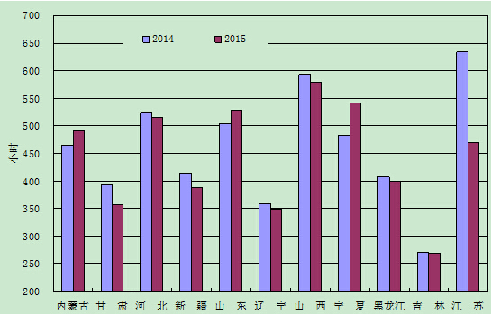 分類型看,1-3月份,全國水電設備平均利用小時609小時,同比提高58小時;水電裝機容量超過1000萬千瓦的7個省份中,青海、云南同比分別下降58小時、55小時,四川基本持平,貴州、廣西同比分別提高354小時、349小時。全國火電設備平均利用小時1106小時,同比下降122小時,降幅比2014年同期擴大120小時;其中青海1601小時,寧夏、海南、江蘇、陜西、江西、新疆、河北超過1200小時;云南和西藏火電設備利用小時低于500小時,分別為497小時和40小時 ;與上年同期相比,共有26個省份火電利用小時同比下降,其中,重慶、四川、北京和廣西下降超過300小時。全國核電設備平均利用小時1638小時,同比下降202小時。全國風電設備平均利用小時483小時,同比上升4小時,其中江蘇、上海和貴州下降顯著,同比分別下降164小時、135小時和122小時。