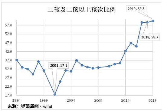 統(tǒng)計(jì)局抽樣調(diào)查顯示,在出生人口中,二孩及以上孩次比例達(dá)到59.5%,較2018年繼續(xù)上升了0.8個(gè)百分點(diǎn),再次創(chuàng)下新高。與“單獨(dú)二孩”政策實(shí)施前的2012年相比,上升了24個(gè)百分點(diǎn)。