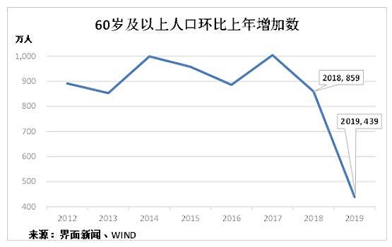 2019年,65周歲及以上人口較上年增加了945萬(wàn)人,該年齡段人口在總?cè)丝谥械恼急壬仙?.7個(gè)百分點(diǎn)至12.6%;60周歲及以上人口增加了439萬(wàn)人,占比升至18.1%。不過(guò),60周歲及以上人口的增量是2012年以來(lái)最少的,較2018年少增加逾400萬(wàn)。