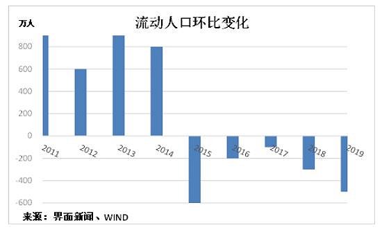 二是2019年流動(dòng)人口減少515萬(wàn),較2018年多減200萬(wàn),也是本輪戶(hù)籍改革以來(lái)連續(xù)第5年減少,2015-2019年合計(jì)減少數(shù)已經(jīng)超過(guò)了1700萬(wàn)。(流動(dòng)人口是指人戶(hù)分離人口中不包括市轄區(qū)內(nèi)人戶(hù)分離的人口。)