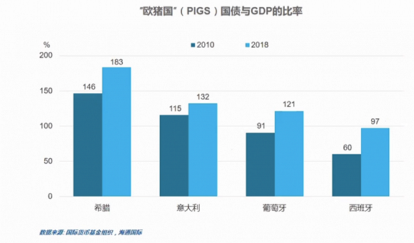 “如果專門看‘歐豬國(guó)’的話,希臘、意大利、葡萄牙和西班牙目前的債務(wù)水平甚至比2009年和2010年歐債危機(jī)的時(shí)候還惡化!彼f(shuō)。葡萄牙、意大利、希臘、西班牙這四個(gè)長(zhǎng)年經(jīng)濟(jì)不景氣的國(guó)家,因其英文國(guó)名首字母組合為“PIGS”,而被國(guó)際經(jīng)濟(jì)學(xué)界稱為“歐豬國(guó)”。