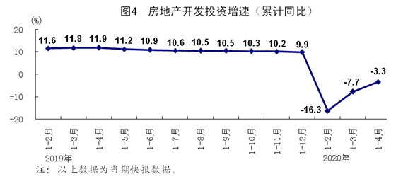 1-4月份,全國固定資產(chǎn)投資(不含農(nóng)戶)136824億元,同比下降10.3%,降幅比1-3月份收窄5.8個(gè)百分點(diǎn);4月份環(huán)比增長6.19%。分領(lǐng)域看,基礎(chǔ)設(shè)施投資同比下降11.8%,制造業(yè)投資下降18.8%,房地產(chǎn)開發(fā)投資下降3.3%,降幅分別比1-3月份收窄7.9、6.4、4.4個(gè)百分點(diǎn)。全國商品房銷售面積33973萬平方米,下降19.3%;商品房銷售額31863億元,下降18.6%,降幅分別比1-3月份收窄7.0和6.1個(gè)百分點(diǎn)。分產(chǎn)業(yè)看,第一產(chǎn)業(yè)投資下降5.4%,第二產(chǎn)業(yè)投資下降16.0%,第三產(chǎn)業(yè)投資下降7.8%,降幅分別比1-3月份收窄8.4、5.9、5.7個(gè)百分點(diǎn)。高技術(shù)產(chǎn)業(yè)投資下降3.0%,降幅小于全部投資7.3個(gè)百分點(diǎn),比1-3月份收窄9.1個(gè)百分點(diǎn);其中,高技術(shù)制造業(yè)和高技術(shù)服務(wù)業(yè)投資分別下降3.6%和1.7%。高技術(shù)制造業(yè)中,計(jì)算機(jī)及辦公設(shè)備制造投資增長15.4%。高技術(shù)服務(wù)業(yè)中,科技成果轉(zhuǎn)化服務(wù)、電子商務(wù)服務(wù)、專業(yè)技術(shù)服務(wù)投資分別增長28.0%、25.6%、12.5%。社會(huì)領(lǐng)域投資下降3.1%,比1-3月份收窄5.7個(gè)百分點(diǎn);其中,衛(wèi)生、教育領(lǐng)域投資同比增速由負(fù)轉(zhuǎn)正,分別增長4.7%、2.9%。
