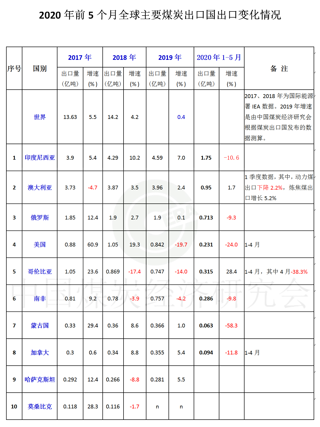 2020年前5個(gè)月全球主要煤炭出口國(guó)出口變化情況