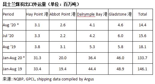 據(jù)阿格斯(Argus)整理的澳大利亞昆士蘭州港口煤炭外運(yùn)出口數(shù)據(jù)顯示,2020年8月,昆士蘭州煤炭出口1440萬噸,比7月份的1562萬噸減少7.7%,比2019年8月份的1806萬噸下降20%。1-8月,昆士蘭州煤炭出口1.34億噸,比2019年同期的1.46億噸減少1240萬噸,同比下降8.5%。