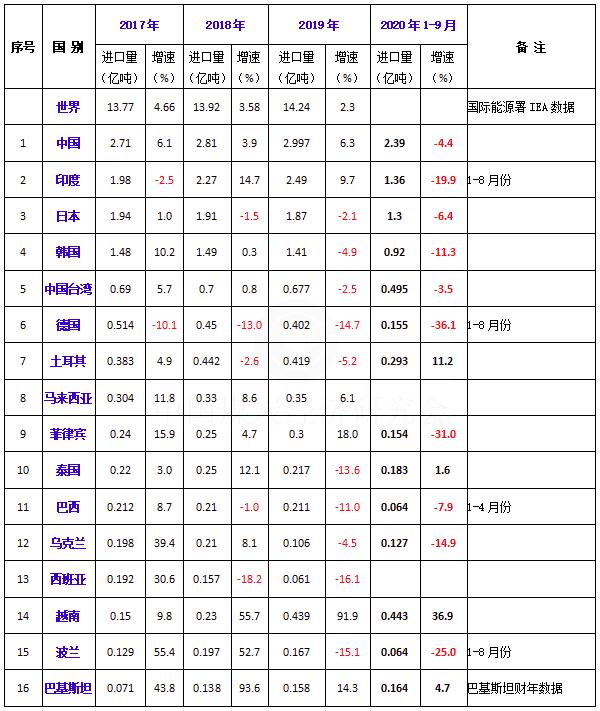 2020年前三季度全球主要煤炭進口國和地區(qū)進口情況