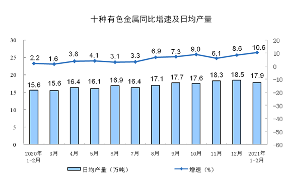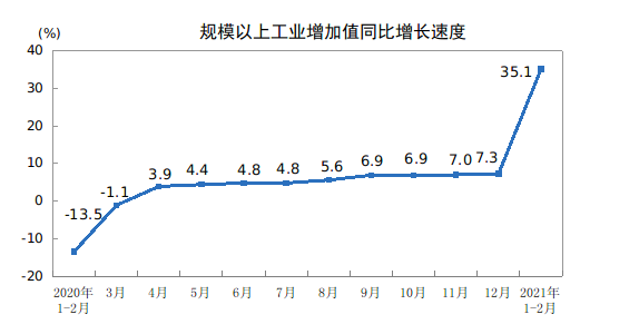 1—2月份,規(guī)模以上工業(yè)增加值同比實際增長35.1 %(以下增加值增速均為扣除價格因素的實際增長率);比2019年1—2月份增長16.9%,兩年平均增長8.1%。從環(huán)比看,2月份,規(guī)模以上工業(yè)增加值比上月增長0.69%。
