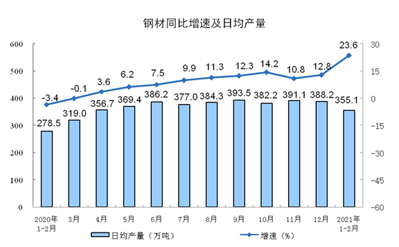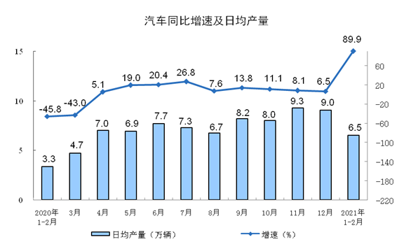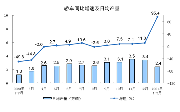 分產(chǎn)品看,1—2月份,612種產(chǎn)品中有565種產(chǎn)品同比增長。鋼材20953萬噸,同比增長23.6%;水泥24129萬噸,增長61.1%;十種有色金屬1056萬噸,增長10.6%;乙烯475萬噸,增長26.7%;汽車385.5萬輛,增長89.9%,其中,新能源汽車31.7萬輛,增長395.3%;發(fā)電量12428億千瓦時,增長19.5%;原油加工量11424萬噸,增長15.0%。