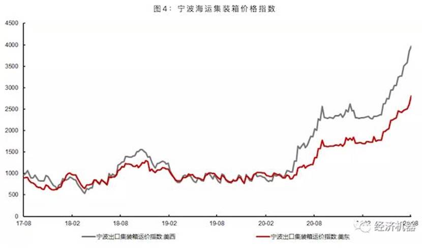 隨著國外主要經(jīng)濟(jì)體經(jīng)濟(jì)的復(fù)蘇和疫情的反復(fù),全球進(jìn)口依舊旺盛,從高頻的集裝箱出口運(yùn)價(jià)指數(shù)看,9月寧波出口集裝箱運(yùn)價(jià)指數(shù)繼續(xù)上行,表明出口依然面臨有力支撐(圖:4)。