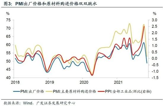 代表工業(yè)價(jià)格的兩個指數(shù)單月調(diào)整幅度較大,PMI購進(jìn)價(jià)格指數(shù)、出廠價(jià)格指數(shù)分別回落19.2個點(diǎn)、12.2個點(diǎn)。從近月價(jià)格走勢看,10月19日發(fā)改委煤電油氣運(yùn)重點(diǎn)企業(yè)保供穩(wěn)價(jià)座談會前后是一個拐點(diǎn)。以動力煤價(jià)格為例,11月底較10月19日高點(diǎn)下行幅度達(dá)57%。