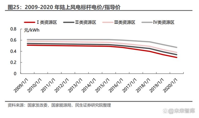 風(fēng)電上網(wǎng)電價(jià)的標(biāo)桿化始于 2009 年,當(dāng)年 7 月 20 日,國家發(fā)改委發(fā)布《關(guān) 于完善風(fēng)力發(fā)電上網(wǎng)電價(jià)政策的通知》(發(fā)改價(jià)格[2009]1906 號),按風(fēng)能資源狀況和工程建設(shè)條件,將全國分為Ⅰ-Ⅳ四類風(fēng)能資源區(qū),相應(yīng)標(biāo)桿上網(wǎng)電價(jià)分別為 0.51、0.54、0.58、0.61 元/千瓦時(shí)。2014 年 6 月 5 日,發(fā)改委發(fā)布了《關(guān)于海上風(fēng)電上網(wǎng)電價(jià)政策的通知》(發(fā)改價(jià)格[2014]1216 號),對當(dāng)時(shí)尚未開始大規(guī)模 發(fā)展的海上風(fēng)電,制定了標(biāo)桿上網(wǎng)電價(jià)。通知規(guī)定,2017年以前投運(yùn)的近海風(fēng)電 項(xiàng)目上網(wǎng)電價(jià)為 0.85 元/千瓦時(shí),潮間帶風(fēng)電項(xiàng)目上網(wǎng)電價(jià)為 0.75 元/千瓦時(shí)。 在執(zhí)行了 5 年后,風(fēng)電標(biāo)桿電價(jià)迎來首次下調(diào),2014 年底公布的《關(guān)于適當(dāng) 調(diào)整陸上風(fēng)電標(biāo)桿上網(wǎng)電價(jià)的通知》(發(fā)改價(jià)格[2014]3008 號)將第 I 類、II 類和 III類資源區(qū)風(fēng)電標(biāo)桿上網(wǎng)電價(jià)降低 2 分/千瓦時(shí)。一年后,《關(guān)于完善陸上風(fēng)電光伏發(fā)電上網(wǎng)標(biāo)桿電價(jià)政策的通知》(發(fā)改價(jià)格[2015]3044 號)公布,再次將I、II、 III類資源區(qū)風(fēng)電標(biāo)桿上網(wǎng)電價(jià)降低 2 分/千瓦時(shí),Ⅳ類資源區(qū)降低 1 分/千瓦時(shí)。 通知同時(shí)提前設(shè)定了2018 年起的風(fēng)電標(biāo)桿電價(jià),但又是在一年后,2016 年 12 月 26 日發(fā)布的《關(guān)于調(diào)整光伏發(fā)電陸上風(fēng)電標(biāo)桿上網(wǎng)電價(jià)的通知》(發(fā)改價(jià)格 [2016]2729 號),大幅下調(diào) 2018 年起的風(fēng)電標(biāo)桿上網(wǎng)電價(jià),Ⅰ-Ⅳ四類資源區(qū)的 電價(jià)相比 2016-2017 年分別降低了 7、5、5、3 分/千瓦時(shí)。