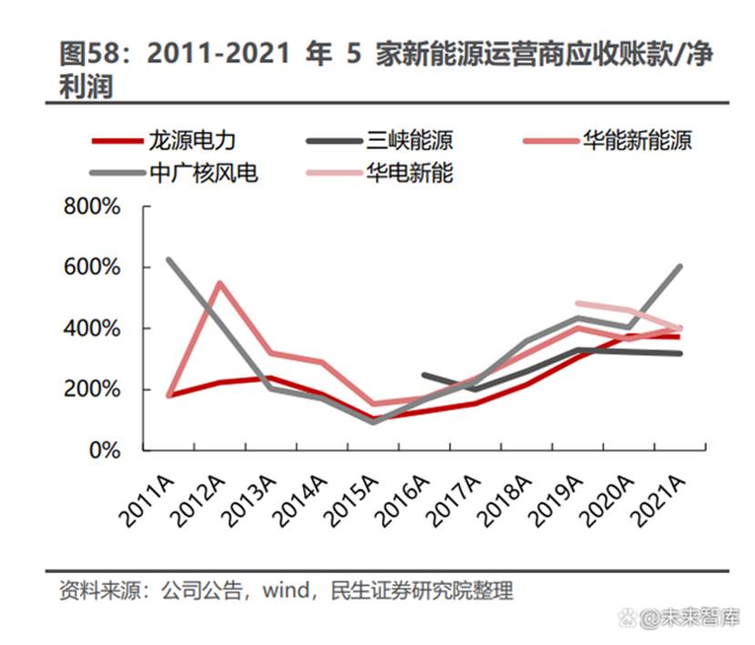 對比各年度期末應(yīng)收賬款余額和全年凈利潤、營業(yè)收入、經(jīng)營凈現(xiàn)金流以及期末凈資產(chǎn),可以發(fā)現(xiàn)應(yīng)收賬款對企業(yè)經(jīng)營造成了影響。同樣以這 6 家公司為例: 期末應(yīng)收賬款/當(dāng)年凈利潤:6 家公司在 2021 年度的比值均在 300%以 上,最高的是大唐新能源,達(dá)到了 9 倍;2016-2021 年均值均超過 250%, 大唐新能源接近 9.5 倍。 期末應(yīng)收賬款/當(dāng)年?duì)I業(yè)收入:除龍?jiān)措娏ν,其?/span> 5 家公司在 2021 年 度的比值均在 100%以上,即期末應(yīng)收賬款大于全年?duì)I業(yè)收入;而 2016- 2021 年均值也都接近 100%上下。龍?jiān)措娏Φ谋戎递^低,主要是因?yàn)槠?/span> 有一定體量的裝機(jī)是火電,營收中沒有補(bǔ)貼部分。 期末應(yīng)收賬款/當(dāng)年經(jīng)營凈現(xiàn)金流:6 家公司在 2021 年度的比值在 150% 以上,除龍?jiān)措娏ν猓溆?/span> 5 家甚至在 200%以上;2016-2021 年均值 基本在 1 倍以上,華電新能甚至超過 2 倍。 期末應(yīng)收賬款/期末凈資產(chǎn):6 家公司在 2021 年度的比值在 25%以上, 華能新能源、大唐新能源、華電新能超過 50%;2016-2020 年均值在 20% 以上。