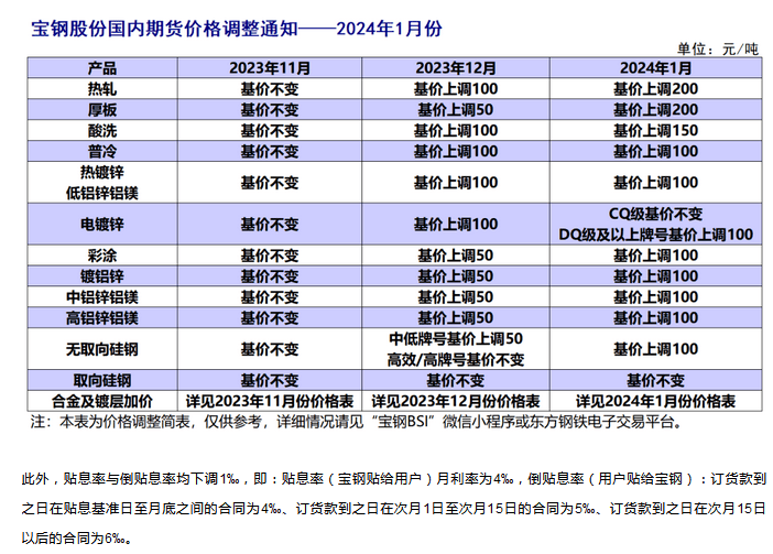 經(jīng)研究決定,寶鋼股份板材內(nèi)銷(xiāo)價(jià)格2024年1月份在2023年12月份基礎(chǔ)上調(diào)整公告如下(以下除特殊注明外,均為不含稅):