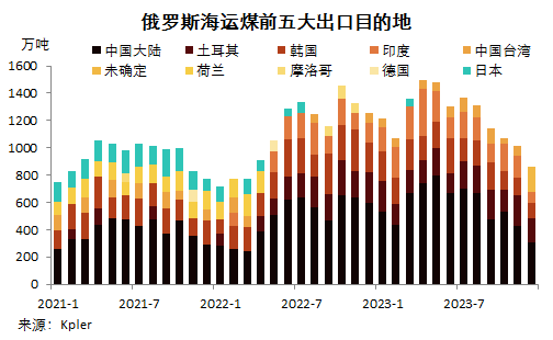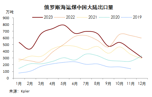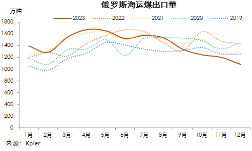 Kpler船舶追蹤數(shù)據(jù)顯示,2023年12月份,俄羅斯海運煤出口量1082.13萬噸,環(huán)比降9.97%,連續(xù)第五月環(huán)比下降,同比降24.62%。