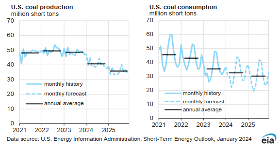 1月9日,美國能源信息署(EIA)發(fā)布最新《短期能源展望》報(bào)告顯示,2024年,美國煤炭產(chǎn)量預(yù)計(jì)較2023年的5.817億噸下降14.34%,至4.893億短噸(4.44億噸)。