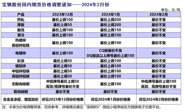 經(jīng)研究決定,寶鋼股份板材內(nèi)銷價格2024年2月份在2024年1月份基礎(chǔ)上調(diào)整公告如下(以下除特殊注明外,均為不含稅):