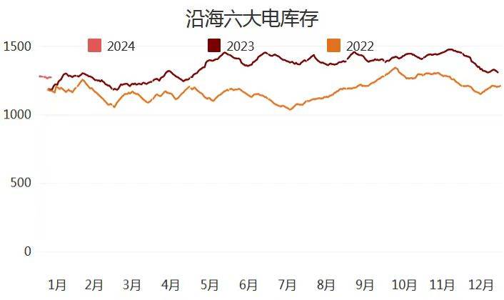 截止1月12日,沿海六大電廠日耗85.9萬(wàn)噸,周環(huán)比下降1.1萬(wàn)噸,總庫(kù)存合計(jì)1276.4萬(wàn)噸,周環(huán)比上升8.4萬(wàn)噸?捎锰鞌(shù)14.8周環(huán)比上升0.2天。