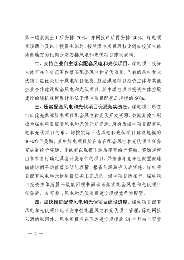 所有為煤電項目配套風電和光伏項目的市,均按實際下達風電和光伏項目建設規(guī)模的30%給予獎勵。