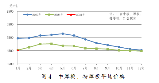 1月份,中厚板產(chǎn)量520萬噸,同比增加11萬噸,上升2.2%;銷售507萬噸,其中出口30萬噸,產(chǎn)銷率97.5%;售價4496元/噸,比上月上漲51元/噸。中厚板、特厚板平均價格見圖4。