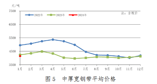 1月份,中厚寬鋼帶產(chǎn)量654萬噸,同比減少11萬噸,下降1.7%;銷售666萬噸,其中出口58萬噸,產(chǎn)銷率101.8%;售價4180元/噸,比上月上漲53元/噸。中厚寬鋼帶平均價格見圖5。