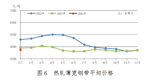 1月份,熱軋薄寬鋼帶產(chǎn)量244萬噸,同比增加21萬噸,上升9.4%;銷售250萬噸,其中出口32萬噸,產(chǎn)銷率102.5%;售價4265元/噸,比上月上漲56元/噸。熱軋薄寬鋼帶均價見圖6。