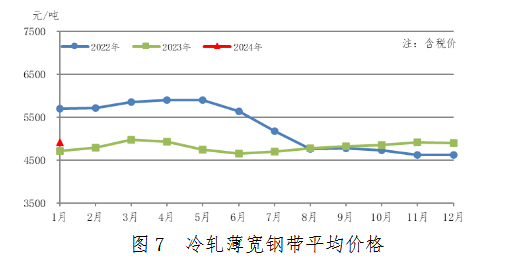 1月份,冷軋薄寬鋼帶產(chǎn)量356萬噸,同比增加7萬噸,上升2.0%;銷售355萬噸,其中出口15萬噸,產(chǎn)銷率99.7%;售價4928元/噸,比上月上漲19元/噸。冷軋薄寬鋼帶平均價格見圖7。