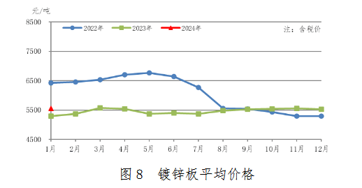 1月份,鍍鋅板產(chǎn)量226萬噸,同比增加12萬噸,上升5.6%;銷售226萬噸,其中出口17萬噸,產(chǎn)銷率100.0%;售價5559元/噸,比上月上漲39元/噸。鍍鋅板平均價格見圖8。