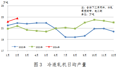 2月份生產(chǎn)660萬(wàn)噸,同比增加61萬(wàn)噸,上升10.3%;其中商品量447萬(wàn)噸,同比增加47萬(wàn)噸,上升11.8%;供下工序用料214萬(wàn)噸,同比增加14萬(wàn)噸,上升7.1%。冷連軋機(jī)累計(jì)生產(chǎn)1349萬(wàn)噸,同比增加107萬(wàn)噸,上升8.6%。