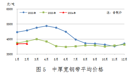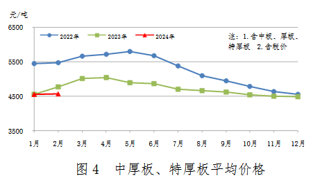 2月份,中厚板產(chǎn)量503萬(wàn)噸,同比增加31萬(wàn)噸,上升6.5%;銷售492萬(wàn)噸,其中出口29萬(wàn)噸,產(chǎn)銷率98.0%;售價(jià)4523元/噸,比上月上漲31元/噸。累計(jì)產(chǎn)量1027萬(wàn)噸,同比增加50萬(wàn)噸,上升5.1%。中厚板、特厚板平均價(jià)格見(jiàn)圖4。