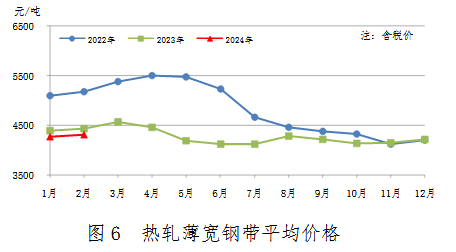 2月份,熱軋薄寬鋼帶產(chǎn)量231萬(wàn)噸,同比增加9萬(wàn)噸,上升3.9%;銷售223萬(wàn)噸,其中出口29萬(wàn)噸,產(chǎn)銷率96.5%;售價(jià)4306元/噸,比上月上漲44元/噸。累計(jì)產(chǎn)量471萬(wàn)噸,同比增加26萬(wàn)噸,上升5.8%。熱軋薄寬鋼帶均價(jià)見(jiàn)圖6。