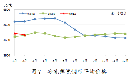 2月份,冷軋薄寬鋼帶產(chǎn)量352萬(wàn)噸,同比增加45萬(wàn)噸,上升14.7%;銷售327萬(wàn)噸,其中出口14萬(wàn)噸,產(chǎn)銷率92.9%;售價(jià)4839元/噸,比上月下跌89元/噸。累計(jì)產(chǎn)量708萬(wàn)噸,同比增加63萬(wàn)噸,上升9.8%。冷軋薄寬鋼帶平均價(jià)格見(jiàn)圖7。