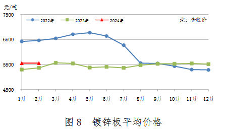 2月份,鍍鋅板產(chǎn)量211萬(wàn)噸,同比增加18萬(wàn)噸,上升9.4%;銷售206萬(wàn)噸,其中出口18萬(wàn)噸,產(chǎn)銷率97.6%;售價(jià)5553元/噸,比上月下跌6元/噸。累計(jì)產(chǎn)量437萬(wàn)噸,同比增加31萬(wàn)噸,上升7.7%。鍍鋅板平均價(jià)格見(jiàn)圖8。