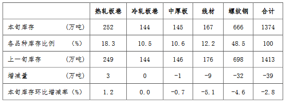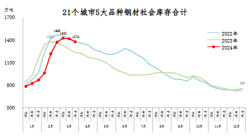 3月下旬,21個(gè)城市5大品種鋼材社會(huì)庫(kù)存1374萬噸,環(huán)比減少39萬噸,下降2.8%,庫(kù)存繼續(xù)下降;比2月下旬增加7萬噸,上升0.7%;比年初增加645萬噸,上升88.5%;比上年同期增加143萬噸,上升11.6%。