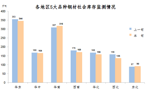 3月下旬,分地區(qū)來看,七大區(qū)域庫(kù)存環(huán)比各有升降,具體情況為:西北庫(kù)存環(huán)比減少21萬噸,下降13.5%,為減量和降幅最大地區(qū);華北減少10萬噸,下降6.0%;西南和華東減量均為9萬噸,分別下降5.1%和2.5%;華中減少2萬噸,下降1.2%;華南增加9萬噸,上升2.9%;東北增加3萬噸,上升3.4%。