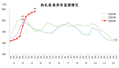 3月下旬,熱軋板卷庫(kù)存252萬噸,環(huán)比增加3萬噸,上升1.2%,庫(kù)存連續(xù)9旬上升;比2月下旬增加19萬噸,上升8.2%;比年初增加108萬噸,上升75.0%;比上年同期增加72萬噸,上升40.0%。