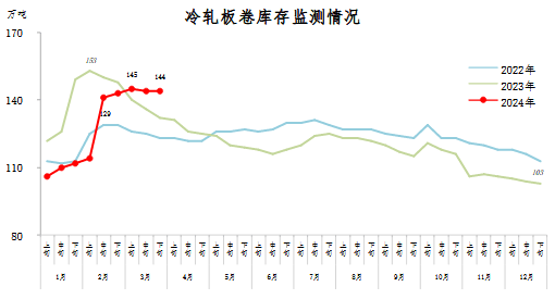 3月下旬,冷軋板卷庫(kù)存144萬噸,環(huán)比持平,近期庫(kù)存波動(dòng)不大;比2月下旬增加1萬噸,上升0.7%;比年初增加41萬噸,上升39.8%;比上年同期增加12萬噸,上升9.1%。