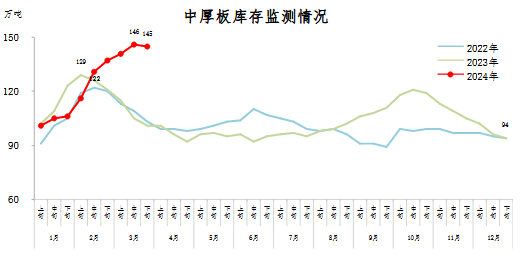 3月下旬,中厚板庫(kù)存145萬噸,環(huán)比減少1萬噸,下降0.7%,庫(kù)存連續(xù)8旬上升后小幅下降;比2月下旬增加8萬噸,上升5.8%;比年初增加51萬噸,上升54.3%;比上年同期增加44萬噸,大幅上升43.6%。