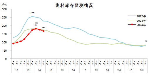 3月下旬,線材庫(kù)存167萬噸,環(huán)比減少9萬噸,下降5.1%,庫(kù)存繼續(xù)下降;比2月下旬減少6萬噸,下降3.5%;比年初增加84萬噸,上升101.2%;比上年同期減少7萬噸,下降4.0%。