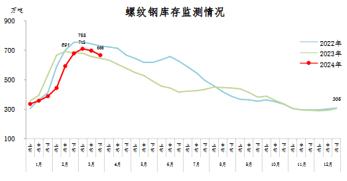 3月下旬,螺紋鋼庫(kù)存666萬噸,環(huán)比減少32萬噸,下降4.6%,庫(kù)存下降速度有所加快;比2月下旬減少15萬噸,下降2.2%;比年初增加361萬噸,上升118.4%;比上年同期增加22萬噸,上升3.4%。